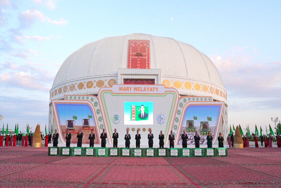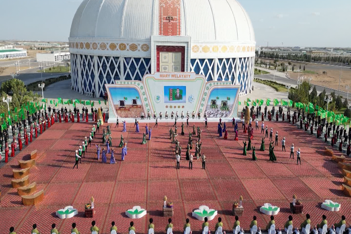 Торжественные торжества по случаю Праздника урожая, широко отмечавшиеся по всей стране в Международный год мира и доверия, в Марыйском велаяте были наполнены и трогательными свадебными торжествами. Грандиозная церемония бракосочетания, совместно организованная хякимликом Марыйского велаята, велаятским управлением культуры, Марыйским велаятским отделением Союза женщин Туркменистана и общественными организациями велаята, прошла у здания «Туркменского белого дома», пропитанного национальным духом нашего народа, расположенного в живописном уголке велаята. В этот праздничный день, вместе с представителями старшего поколения велаята, к месту торжества со свадебным кортежем прибыли работники сельского хозяйства, комбайнеры, хлопкоробы, хлеборобы, мастера-хлеборобы, работники учреждений и предприятий аграрной сферы. Выступившие на церемонии бракосочетания тепло поздравили всех тружеников села велаята с праздником и пожелали им и впредь усердно трудиться и вносить достойный вклад в деятельность Уважаемого Президента по развитию аграрного сектора страны. На церемонии бракосочетания ряду арендаторов, добившихся больших успехов в поставках пшеницы, хлопка и другой сельскохозяйственной продукции, были вручены праздничные подарки от имени Уважаемого Президента. Свадебную церемонию, которая прошла с большим размахом перед зданием «Туркменского Белого дома», продолжил танцевальный коллектив, состоящий из деятелей культуры и искусства, эстрадных певцов и других артистов велаята. Праздник урожая продолжился выступлениями, воспевающими славные мелодии. Литературно-музыкальные выступления Государственного драматического театра имени Кемине региона совместно с деятелями культуры украсили торжество. В выступлениях, посвященных эпохе Возрождения новой эпохи суверенного государства, были восхвалены работы национального и общенационального значения, проделанные нашим героем Аркадаглы Сердаром в развитии аграрного сектора, достижения сельскохозяйственных тружеников, наша благословенная эпоха и Праздник урожая. Нежные звуки музыки и современные танцы, разносившиеся по всему миру, тронули души жителей, принявших участие в торжестве. Представители старшего поколения региона, заботливые матери и руководители аграрного сектора, принявшие участие в праздновании знаменательного 30-летия нашего постоянного нейтралитета, получили духовное наслаждение от трогательных свадебных представлений. Прекрасные изображения хлопка и пшеницы, созданные на свадебной сцене современного здания, придали торжеству неповторимую красоту.