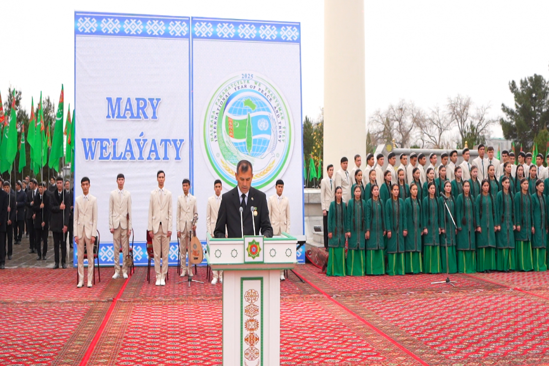 “Halkara parahatçylyk we ýnanyşmak” ýylynda döwletimizde giňden toýlanylýan şanly senäniň – Garaşsyz Watanymyzyň hemişelik Bitaraplygynyň 30 ýyllygynyň hem-de Halkara Bitaraplyk gününiň baýramçylygy Mary welaýatynda-da belent toý tutumlary bilen hem-de ýokary ruhubelentlikde bellenip geçildi. Dünýäde halkara hyzmatdaşlygynyň we döwletleriň arasynda dost – doganlyk gatnaşyklarynyň ösmegine, jebisleşmegine itergi beren hemişelik Bitaraplygymyzyň şanly baýramçylygynyň dabaralary ir säher bilen welaýatyň merkezi Mary şäheriniň iň bir gözel künjegi bolan baş Baýdak meýdançasyndaky dabaralardan başlandy. Bu ýerde döwlet Senamyzyň dabaraly ýerine ýetirilmeginde mukaddes döwlet Baýdagymyz ýokary galdyrylýar. Mary welaýat we Mary şäher häkimlikleriniň, welaýat Zenanlar bölüminiň, Demokratik we Agrar partiýasynyň Mary welaýat komitetleriniň, Kärdeşler arkalaşyklarynyň welaýat birleşmesiniň, Ýaşlar guramasynyň welaýat Geňeşiniň, welaýat Baş bilim, Medeniýet we Saglygy goraýyş müdirlikleriniň bilelikde gurnamaklarynda geçirilen göwün göteriji dabarada eziz Watanymyzyň şanly baýramçylygy mynasybetli mähirli gutlag sözleri aýdylyp, bu gün parahatçylygyň, halklar arasyndaky ylalaşygyň, raýdaşlygyň merkezine öwrülen Türkmenistan döwletimizi bedew bady bilen ösüşleriň täze belentliklerine çykarýan, halkymyzy has rowaç, has eşretli durmuşa alyp barýan Hormatly Prezidentimiz, Arkadagly Gahryman Serdarymyza, Türkmen halkynyň Milli Lideri Gahryman Arkadagymyza tüýs ýürekden çykýan alkyş sözleri beýan edildi. Tutuşlygyna toý - baýramçylyga beslenen meýdançanyň daş-töweregini bezäp duran ýaşyl baýdaklarymyz döwletimiziň mukaddes Garaşsyzlygyny, hemişelik Bitaraplygyny, halkymyzyň bagtyýar durmuşyny, nurana geljegini alamatlandyryp, al-asmanda pasyrdaýar. Baş Baýdak meýdançasynda welaýatyň medeniýet, sungat ussatlarynyň şu şanly sene mynasybetli ýörite taýýarlan çykyşynyň ýaýbaňlandyrylmagy baýramçylyk dabarasynyň şatlyk-şowhunyny has-da artdyrdy. Mary welaýatynyň Kemine adyndaky döwlet drama teatrynyň sahna ussatlarynyň, welaýatyň birleşen tans toparlarynyň edebi – sazly çykyşy baýramçylyk dabarasyna aýratyn öwşgün çaýdy. Welaýat Medeniýet müdirliginiň iň saýlama aýdym – saz we tans toparlarynyň ýerine ýetiren aýdymlary, tanslary hemmeler tarapyndan el çarpyşmalar bilen garşy alyndy. Belent joşgun bilen ýerine ýetirilen aýdym – sazlarda, tanslarda Watanymyzyň mukaddes Garaşsyzlygy, hemişelik Bitaraplygy, milli buýsanjymyz bolan ýaşyl Tugumyz, Berkarar döwletiň täze eýýamynyň Galkynyşy döwri, Hormatly Prezidentimiz Arkadagly Gahryman Serdarymyzyň alyp barýan ynsanperwer daşary syýasaty, il-halk, döwlet hem bütin adazat bähbitli tutumly işleri joşgunly wasp edildi. Baýramçylyk dabarasyna gatnaşan welaýatyň bagtyýar ýaşaýjylary Bitarap Watanymyzy, Berkarar döwletimizi ösüşleriň batly gadamlary bilen öňe alyp barýan türkmen halkynyň Milli Lideri Gahryman Arkadagymyza, Hormatly Prezidentimiz Arkadagly Gahryman Serdarymyza alkyş sözlerini beýan etdiler.